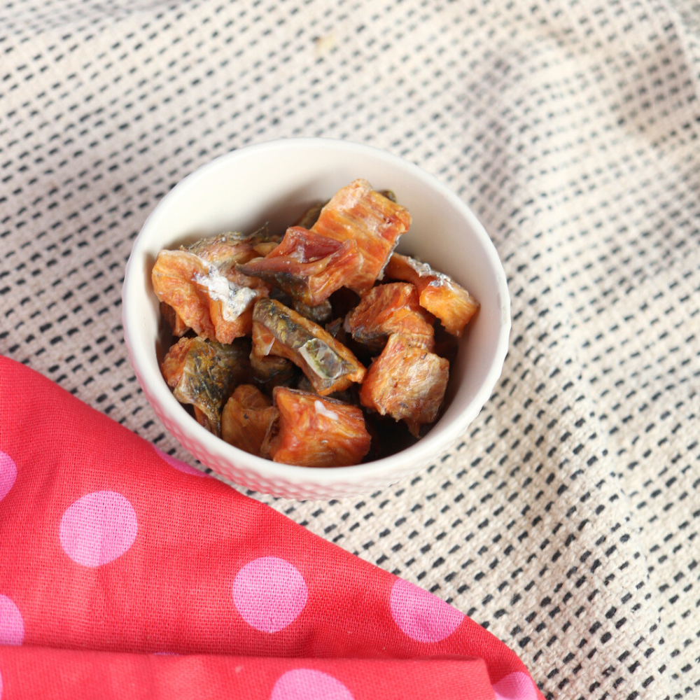 We cut it into chunks for easy feeding (it makes a great training treat!), and you can add it into their meal bowls to boost their meal times with a natural source of Omega-3. The size and texture is also great for cats, who have smaller mouths and bite-force.