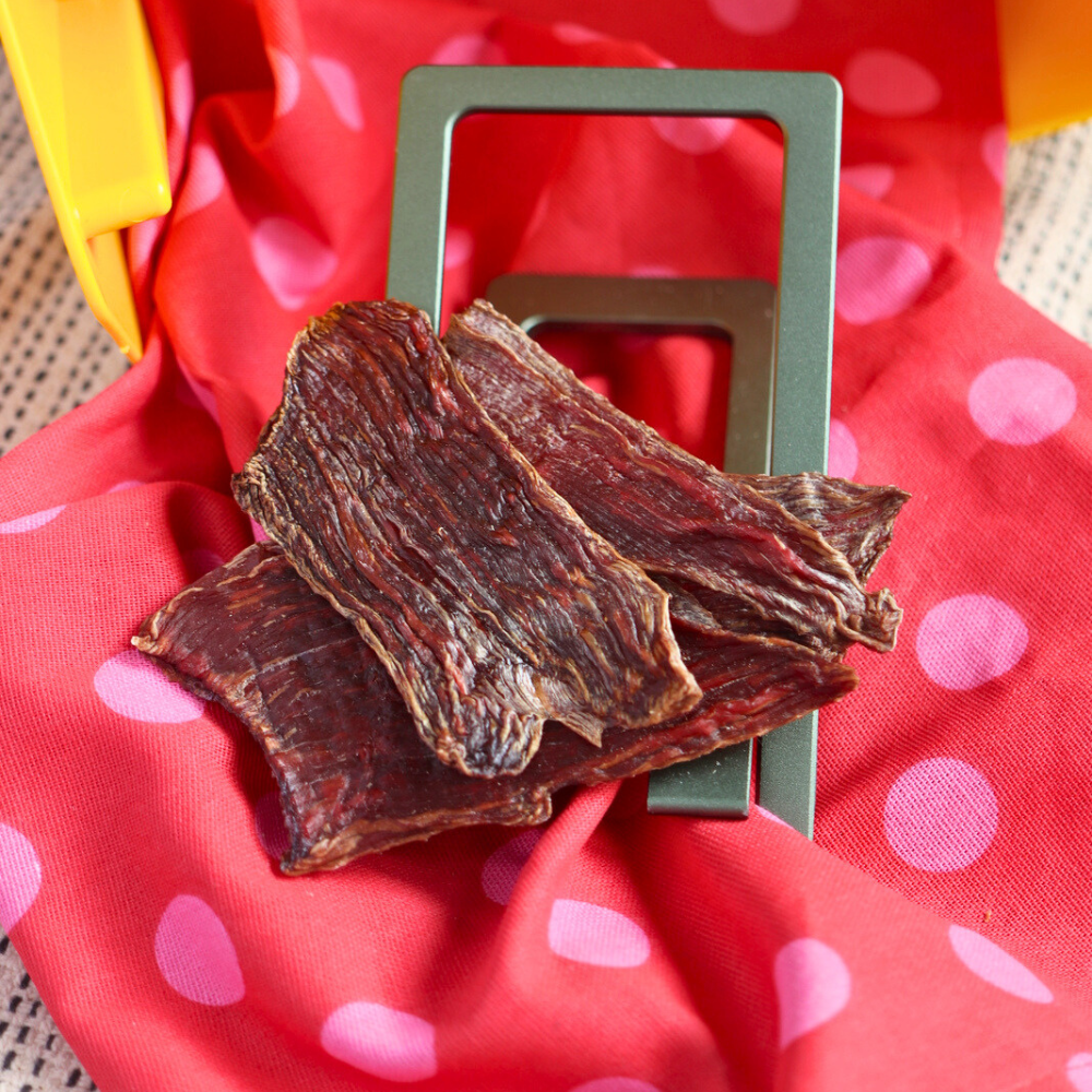 Lean human-grade buffalo is cleaned of visible fats and hand-sliced before being dehydrated gently for a delicious, chewy jerky snack and training treat for your dogs.