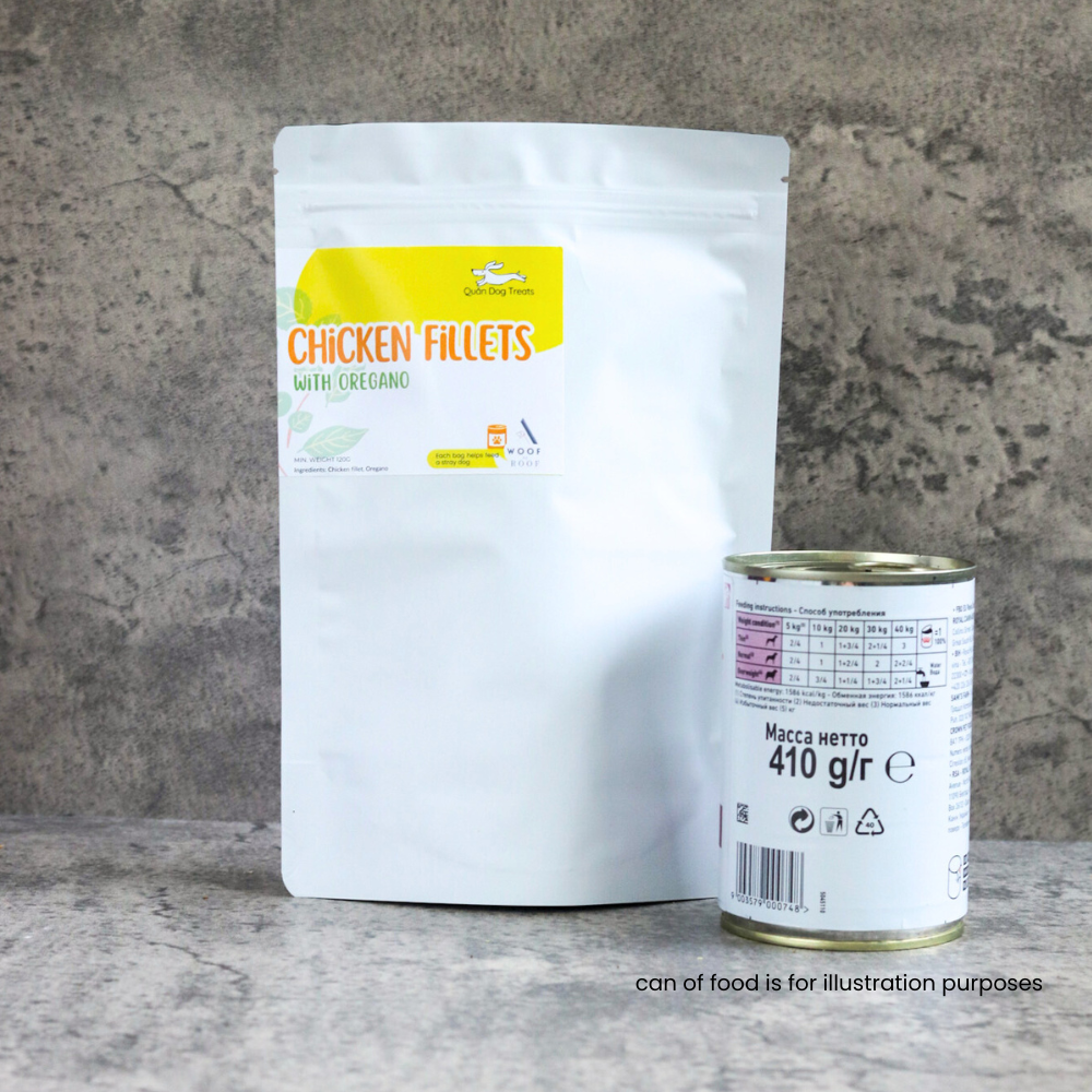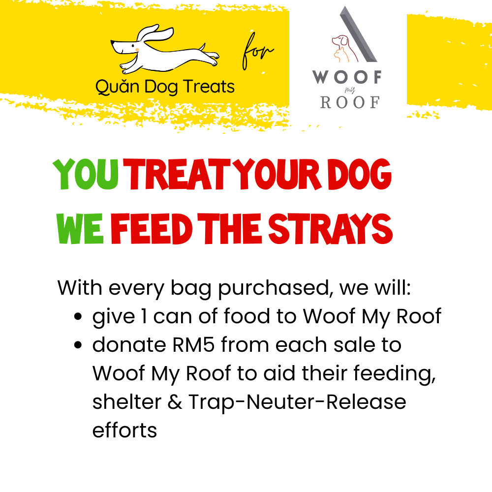 For every bag of Chicken Fillets with Oregano you purchase to treat your pups, we will give 1 can of food to Woof My Roof towards their stray-feeding and shelter activities. In addition, we will give RM5 from every bag sold directly to Woof My Roof towards their shelter and Trap-Neuter-Release program.