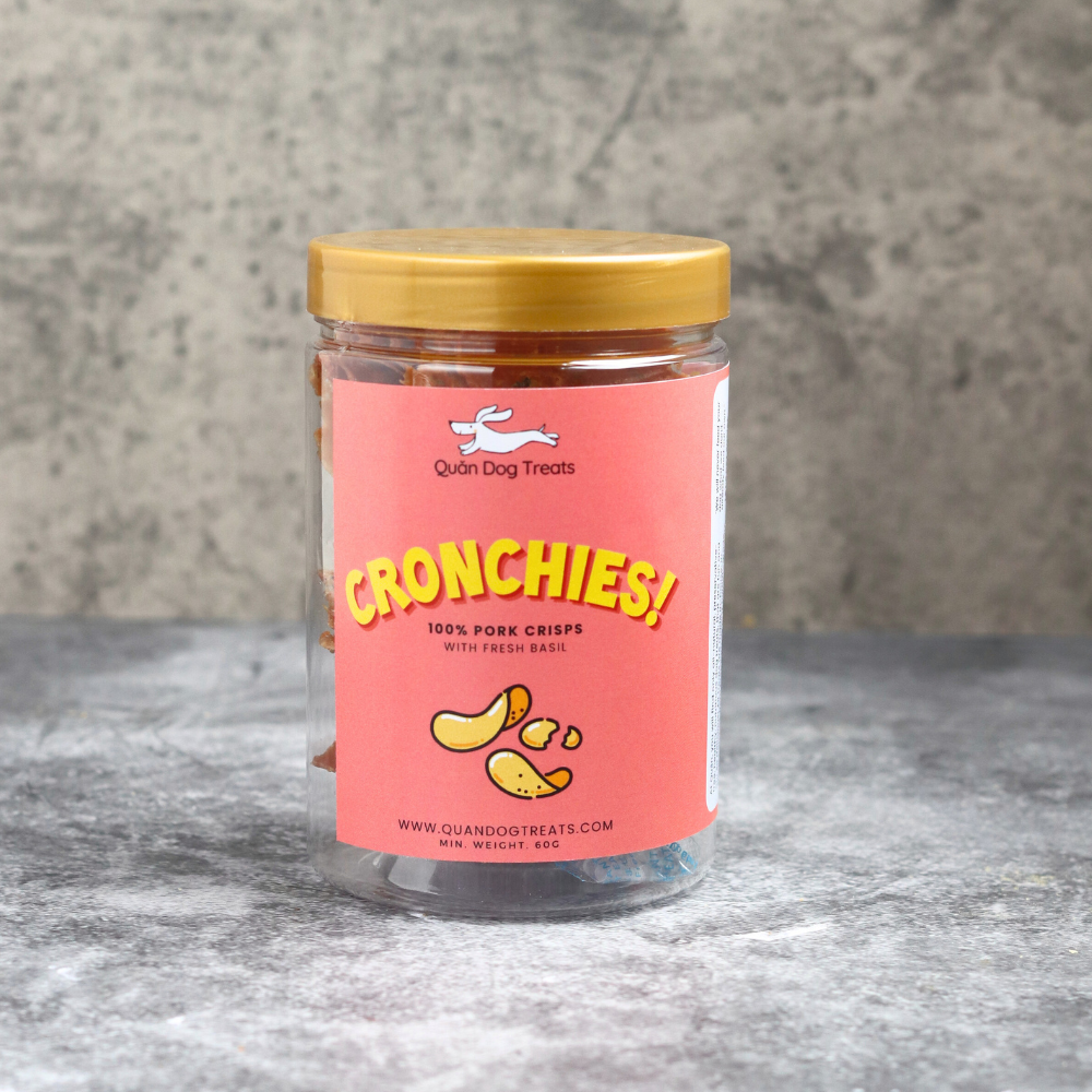 Cronchies! Pork crisps are handmade to be super thin and crispy, just like human-style potato crisps with absolutely no fillers. We added fresh basil, which adds a fragrant, delightful scent and flavour, that is not only enticing to pups, it makes our mouths water too!