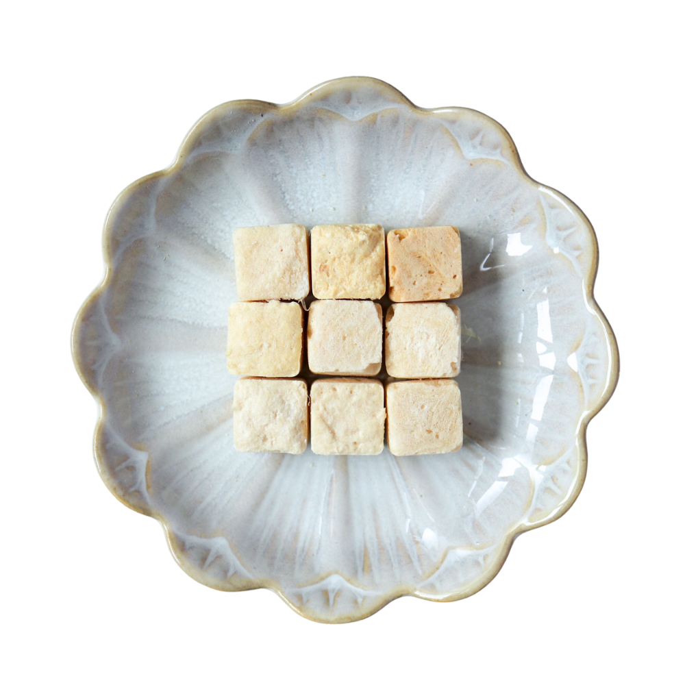 Coco-gai is a fun Nibblet we came up with many months ago, but only managed to get it to work how we wanted it to and is specially made available at the Good Pet Fair. It is an innocuous cube made with pure chicken breast, blended with fresh coconut flesh, and smells yums! It looks plain, and is anything but!