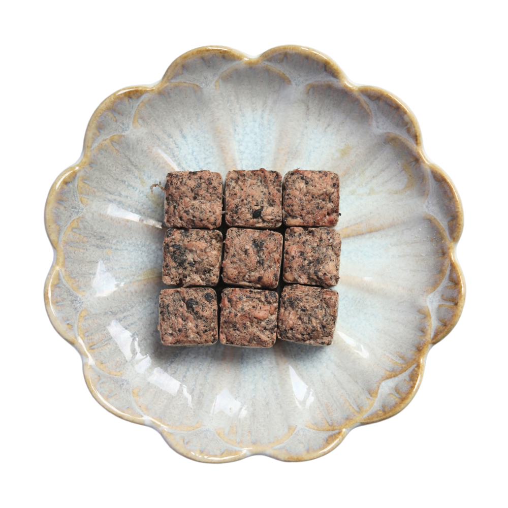 Baa Baa Black Sheep combines 90% local Mutton with black sesame, for a treat that maybe visually shocking, but very appealing to the pups! The little cubes & lightweight texture make it suitable for training as well. The soft texture is suitable for senior dogs, puppies and kitties too!
