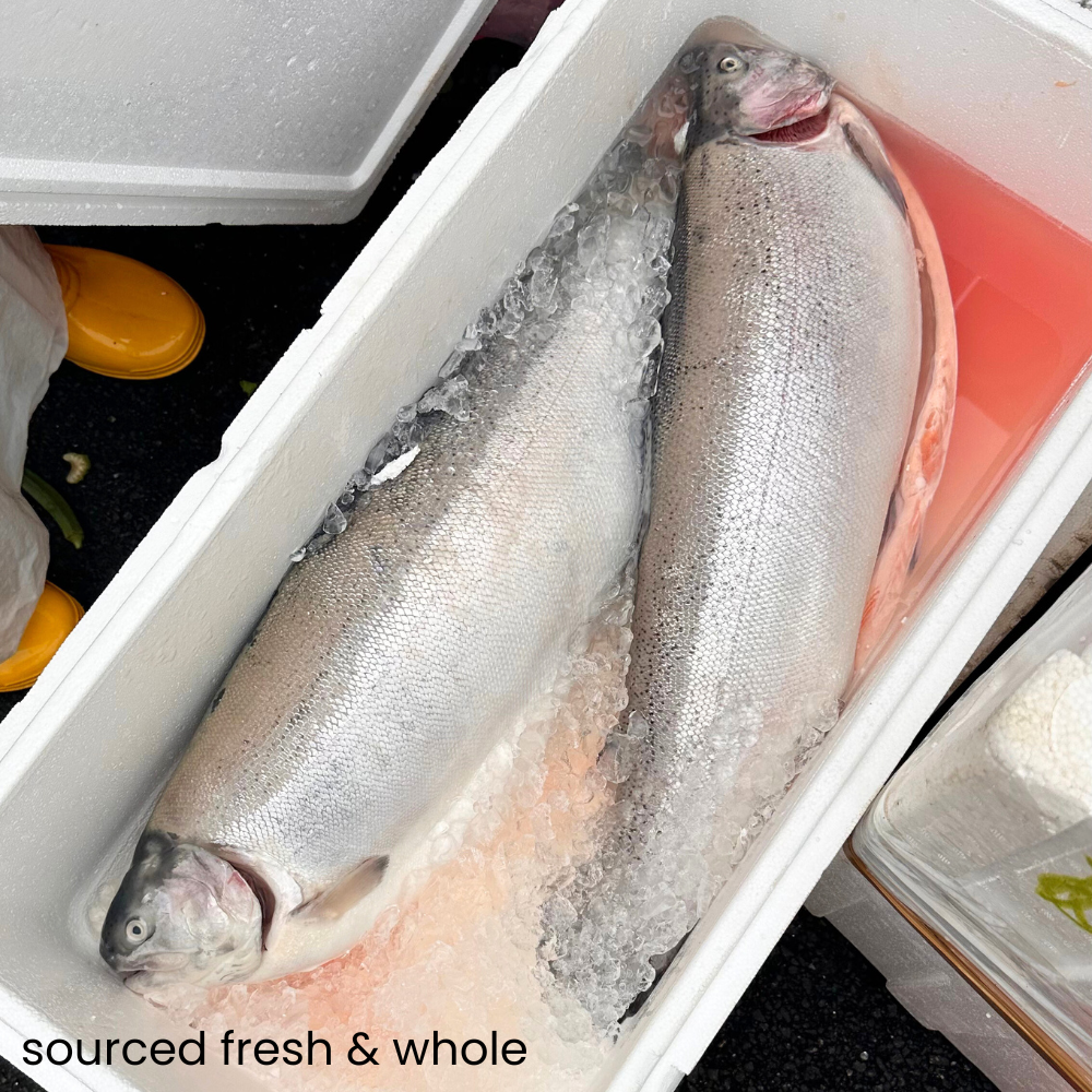 Norwegian fjord trout comes from the pristine, ice-cold Norwegian fjords where seawater meets fresh meltwater from the glaciers. The colour of the meat is brighter than salmon, and the flesh is leaner, as most of the fat is in the belly (which we cannot process as fats do not dry).