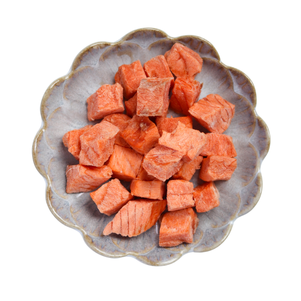 In making these fishy bites, that will have your pup (and kitty) eating out of your hand, we use air-flown chilled Norwegian Fjord Trout, sourced fresh from our fishmonger. We process it directly from the market, using only the meat from the fillet, after trimming off the skin and fat.